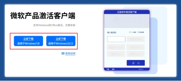 4.激活工具:分Win7/8 专用和Win10/11 专用正版软件激活客户端,均支持 Windows 和 Office 系列软件激活,无需安装,直接下载使用。