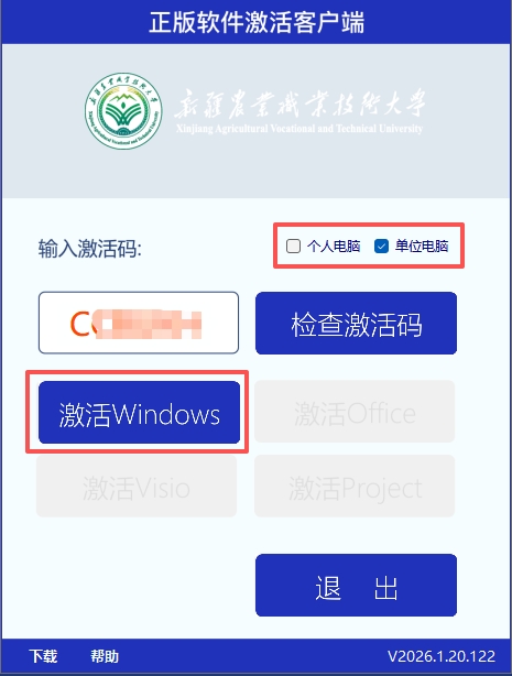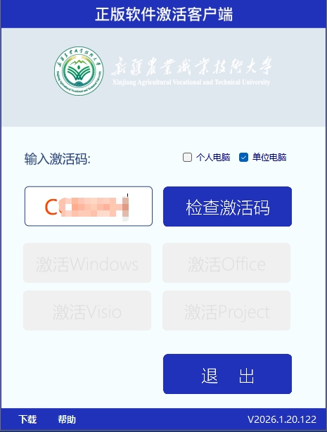 2.打开激活客户端,在输入框中粘贴已获取的个人专属激活码,并根据使用场景勾选个人电脑或单位电脑;