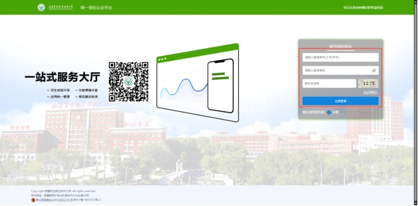 3.首次访问将弹出学校智慧校园统一身份认证界面,输入工号/学号、登录密码及图片验证码,点击立即登录完成平台验证。