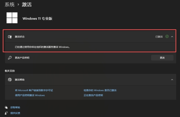 5.验证激活状态:打开设备「设置 - 系统 - 激活」,可查看 Windows 系统显示已激活(通过所在组织的激活服务),即为激活成功。