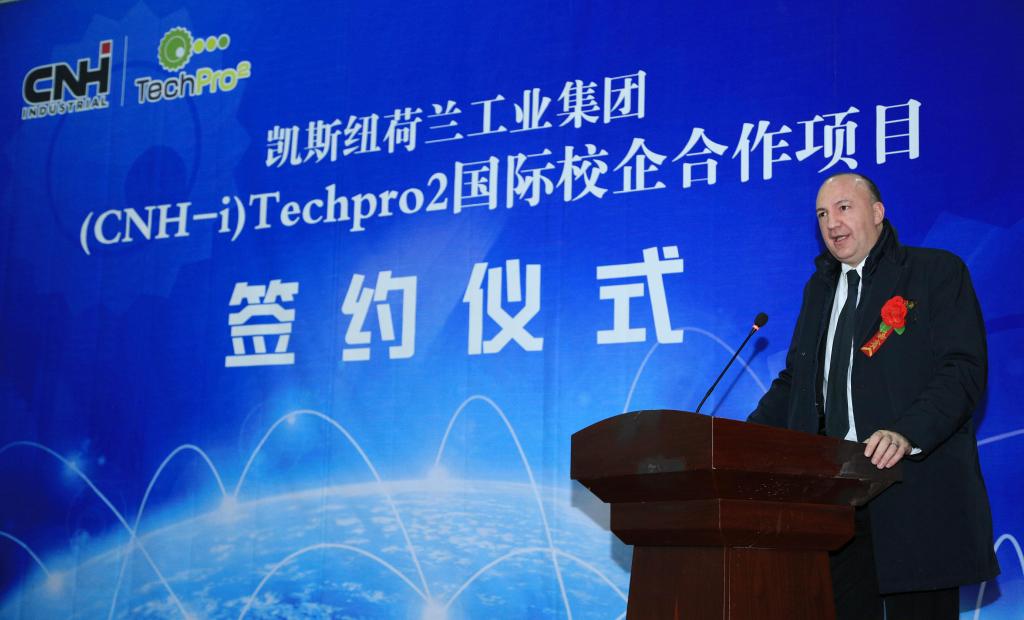 CNH Luca MAINARDI总裁讲话。他首先介绍了公司的基本情况。凯斯纽荷兰是一家大型跨国企业,旗下有12个全球品牌,全球业务遍布180个国家与地区。公司有63000多名员工,66个生产厂,2017年实现营业收入274亿美元. 公司在纽约证交所和米兰证交所两地挂牌上市。产品涉及农业机械、工程机械、商用车和动力总成解决方案。公司还成立了专门的金融服务部门为产品销售提供金融支持。在中国总共经营7个品牌,同时也有凯斯纽荷兰金融为品牌产品销售和客户提供金融服务支持。连同3家合资公司在内,在国内共有员工约9,000名, 6家生产工厂,网络包括2000多家经销商和服务站。他说:“新疆是凯斯纽荷兰重要战略市场,要保持在这一地区的繁荣及优势,必须持续不断地投入新疆地区的发展。” 凯斯纽荷兰工业集团和兄弟集团菲亚特克莱斯勒汽车在全球多个市场广泛开展TechPro2项目。目前我们与来自世界各地的60所学校开展了TechPro2项目合作,培训学员近13,000多名,累计学时超过38万。在中国,与意中育人一起,在2014年和2016年分别在浙江常山和吉林延边开设该项目,累计已有近170名学员完成培训。他们中大部分人在凯斯纽荷兰工业集团的网络就业,其余学员也进入了行业其它公司的网络工作。TechPro2是多方共赢的项目,希望新疆项目能够取得更加丰硕的成果。