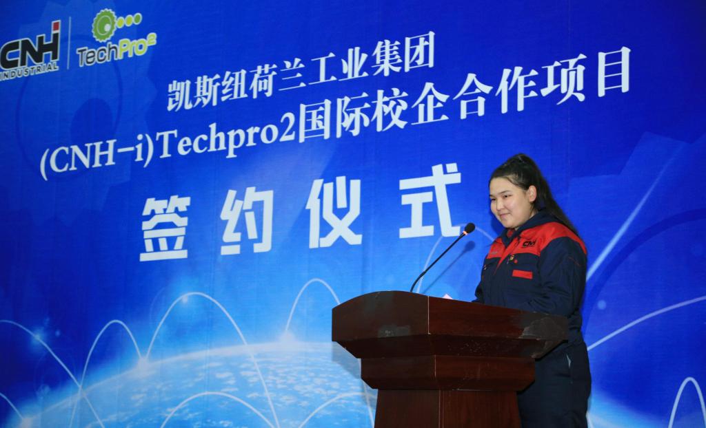 她代表全班同学,向凯斯纽荷兰工业集团、意中育人公司、新疆农业职业技术学院表示最真诚的感谢,并表示一定会好好努力,不辜负学院和企业的培育和期待。