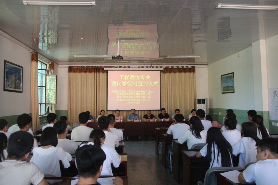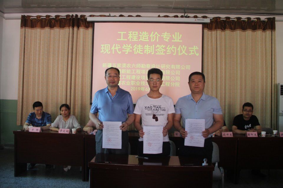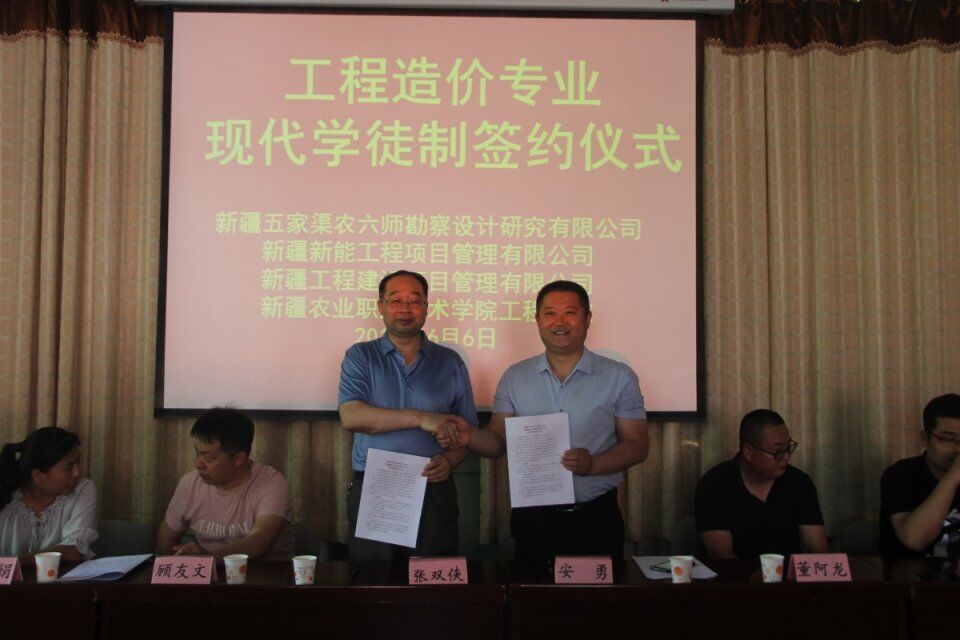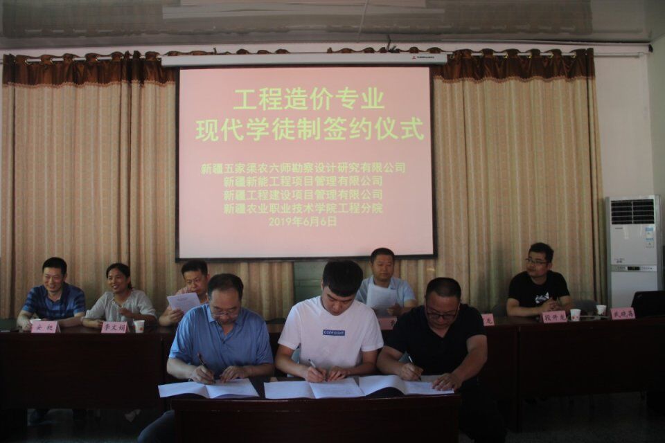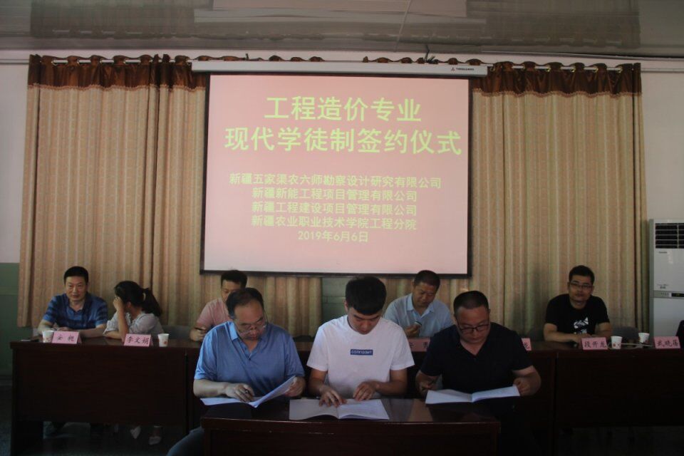 校企合作是高等院校培养高技能人才、彰显办学特色的重要途径。2019年6月6日下午,新疆农业职业技术学院工程分院与新疆五家渠农六师勘察设计研究有限公司,新疆新能工程项目管理有限公司及新疆工程建设项目管理有限公司在屯河校区图书馆二楼会议室举行了“工程造价专业现代学徒制签约仪式”。会议由分院教务科科长武晓蓓主持。五家渠农六师勘察设计研究有限公司监理部副总经理段开龙,检测机构总经理董阿龙;新疆新能工程项目管理有限公司综合人事经理安勇和新疆工程建设项目管理有限公司综合办副主任李文娟,分院院长张双侠、建筑教研室主任安昶、建筑教研室全体教师及30名现代学徒制班的学员出席会议。
