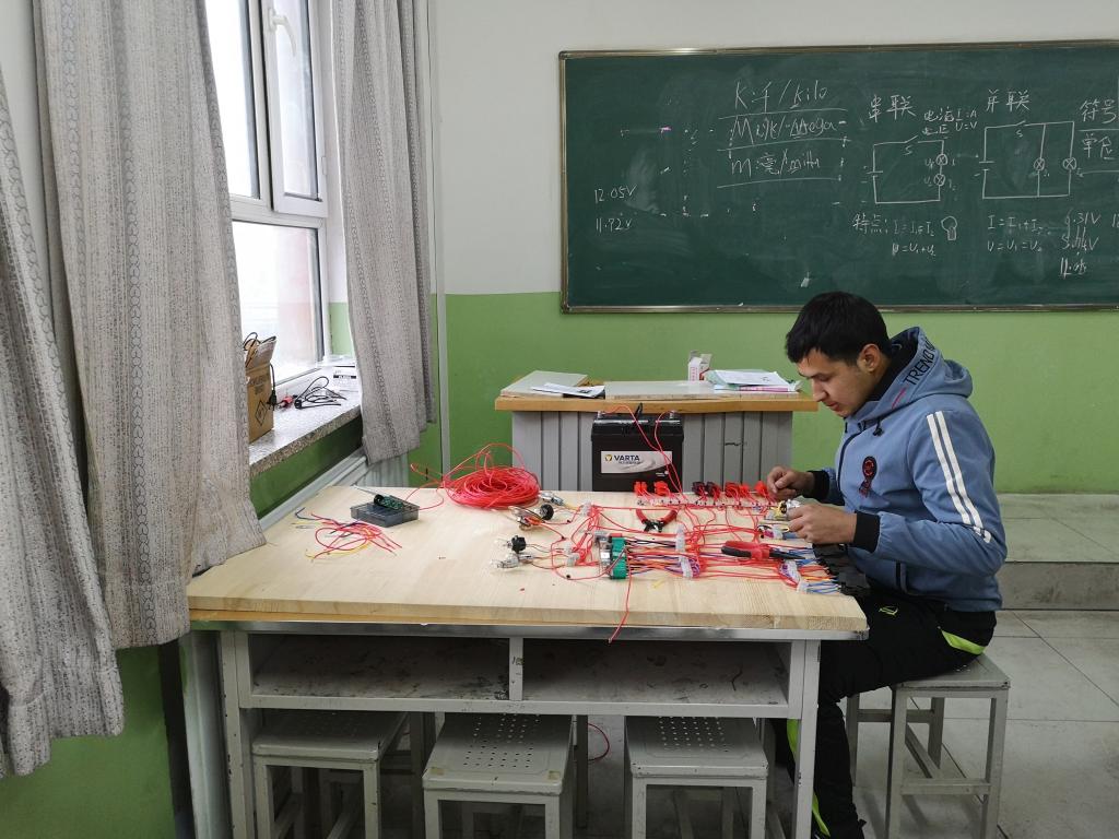 交机仪式后全体领导和嘉宾参观了学生的专业技能展示,看着学生们能熟练拆卸变速器、准确找出拖拉机电路故障,大家对学生们在短短一个学期的学习之后,能够有如此熟练的技术,都表示非常惊讶。当看到2018CNH班努尔艾力·艾合买提小组连接的电路板时,领导和嘉宾对学生的学习成果都连连称赞。