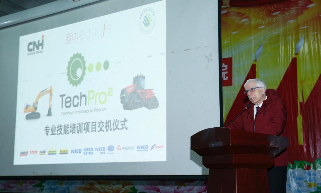 姑丽娜尔·吾布力代表政府讲话。她说:“国家明确提出农业机械化和农机装备是转变农业发展方式、提高农村生产力的重要基础,是实施乡村振兴战略的重要支撑。当前农业机械化和农机装备产业发展不平衡不充分的问题比较突出,特别是农机创新能力不强、农机农艺结合不够紧密等问题亟待解决。”她表示,新疆农业职业技术学院与凯斯纽荷兰工业集团(CNH-i)意中育人商务咨询有限公司联合发起的TechPro2国际校企合作项目,是具体实施国家战略、服务地方经济发展、培养农机技术人才的有力举措。作为新疆农机主管部门,有责任,也有义务为项目的顺利实施提供一切尽可能的支持,从而进一步促进新疆农机事业蓬勃发展。