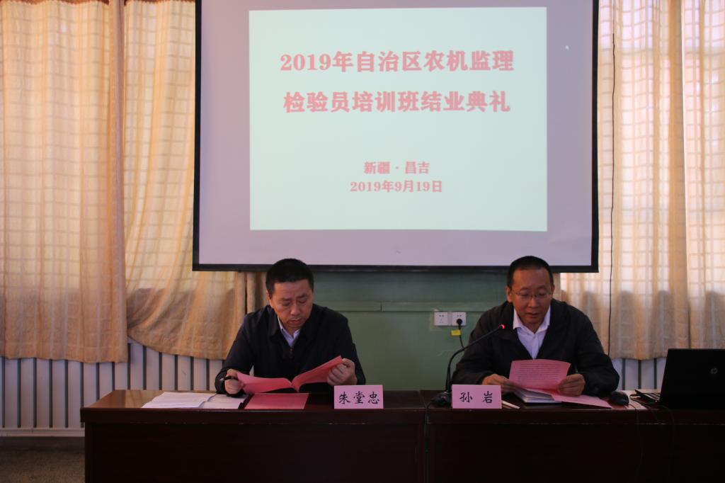 典礼由孙岩主持。首先为4位学员代表发放了考试员证书,接下来塔城地区农机监理所陈小勇代表学员发言。他说:“此次培训班理论与实践相结合的授课方式使我们受益良多。学习了国务院及自治区相关农机条例、规范,观看了农机安全生产宣传教育片,观摩并实际操作了农机安全检验新装备,对拖拉机和联合收割机外廓尺寸、唯一性检验、制动性能、方向盘转向角等检验项目进行了实践。”他表示,短短5天的学习,使学员们掌握了新的设备仪器检测要领,对现场检验要求有了更深的体会,对依法实施农机安全技术检验的重大责任、意义有了更深的体会。这次培训,使学员们的业务知识水平得到了较大的扩展,工作能力有了进一步的提升,对农机检验工作的开展有了更大的帮助。