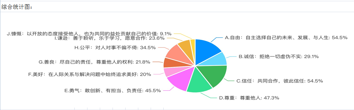 程琦采用在线方式向同学们发放了调查问卷,让同学们从“自由、诚信、信任、尊重、勇气、美好、善良、公平、谦逊、慷慨”10种品质中,选择自己觉得最重要的3种品质,以此了解同学们的心理状态。从调查结果看来,同学们都非常积极向上,对学习农机专业具有浓厚兴趣。