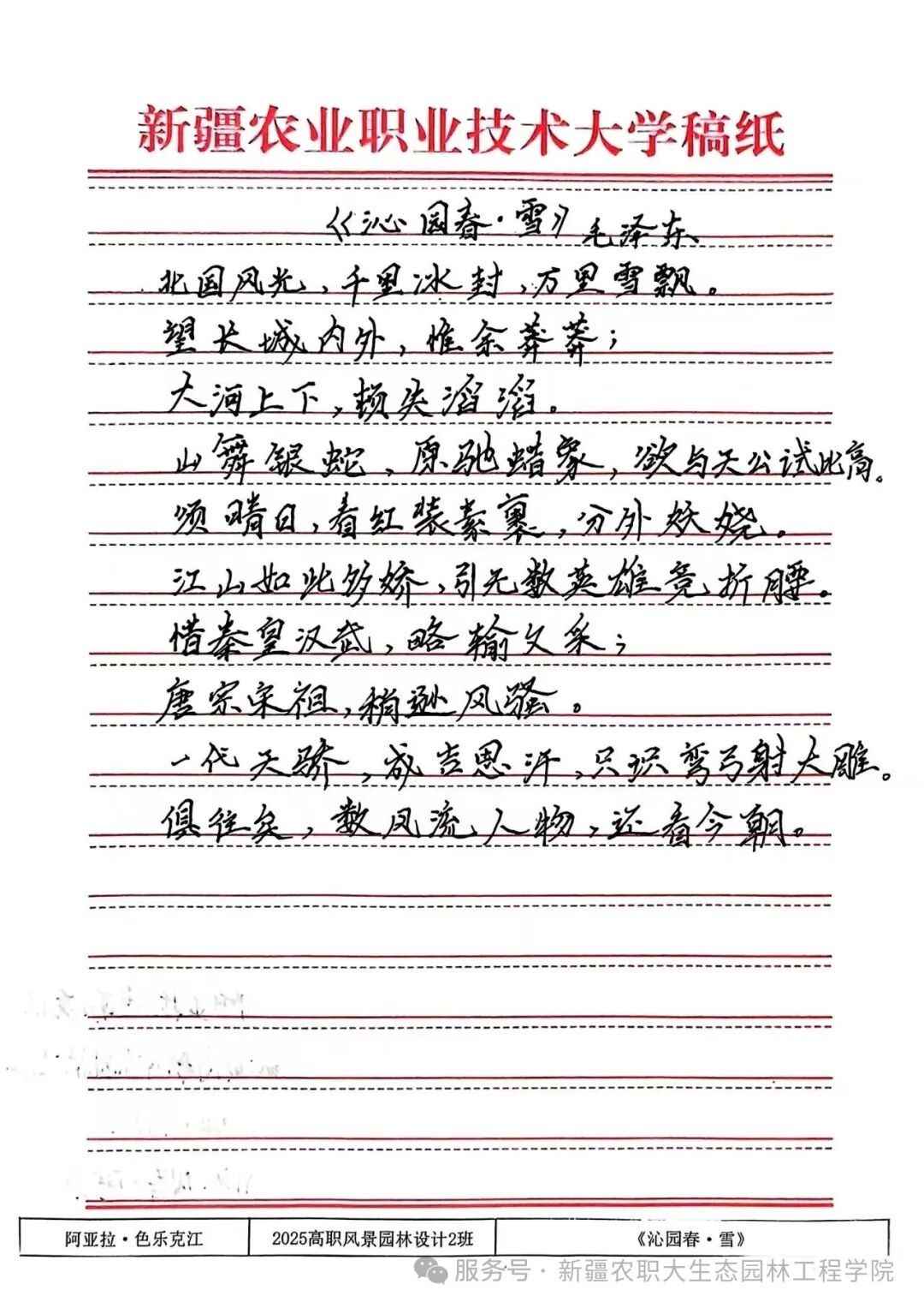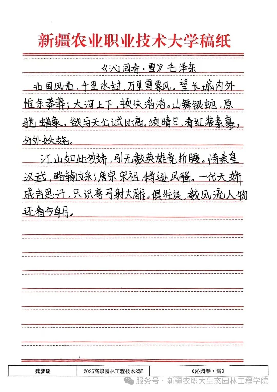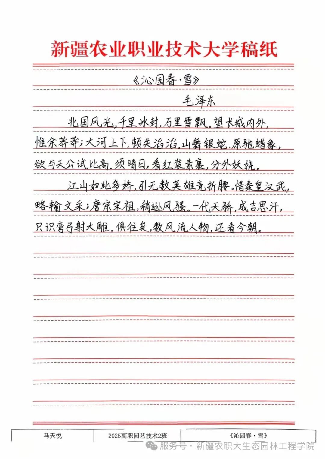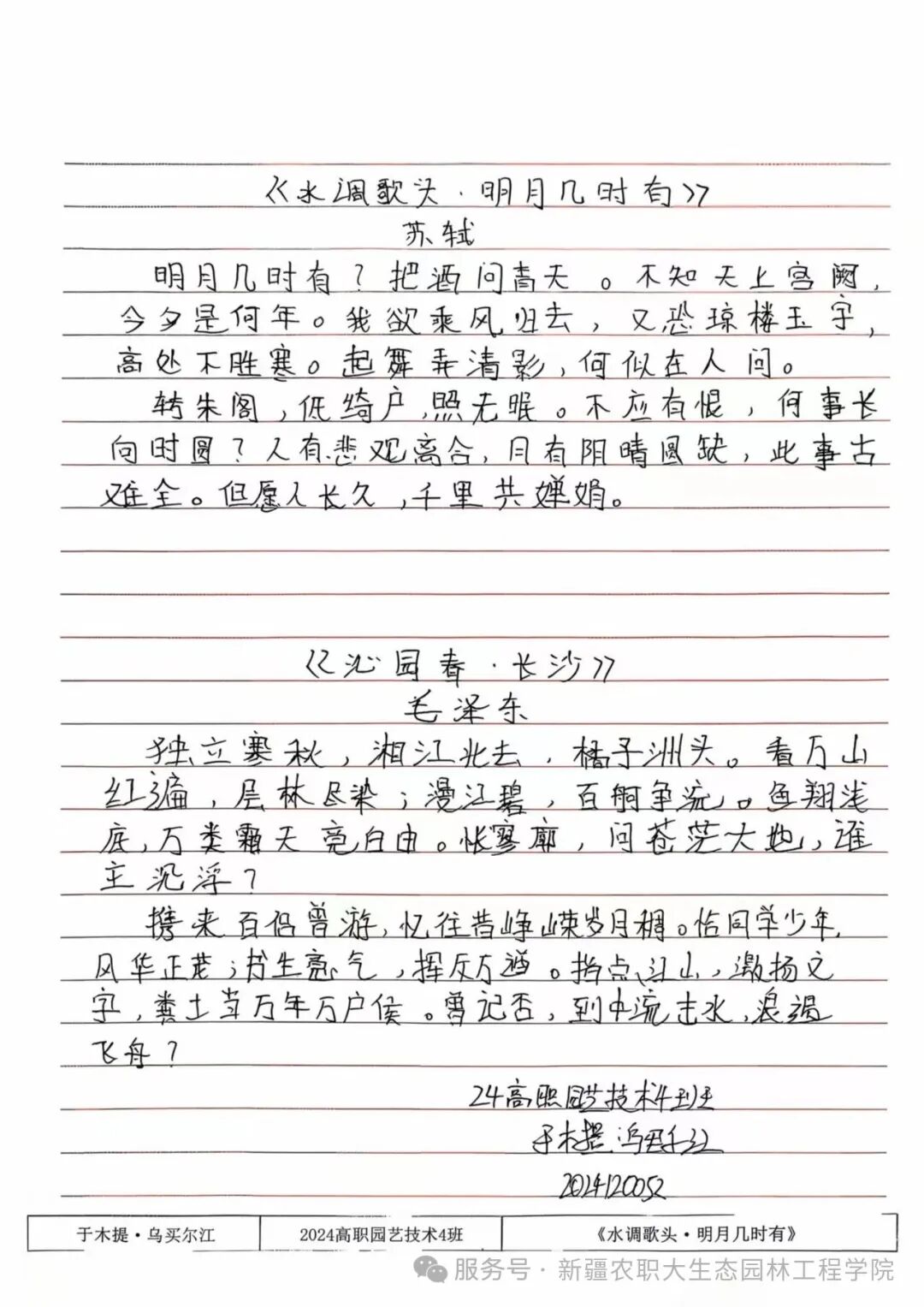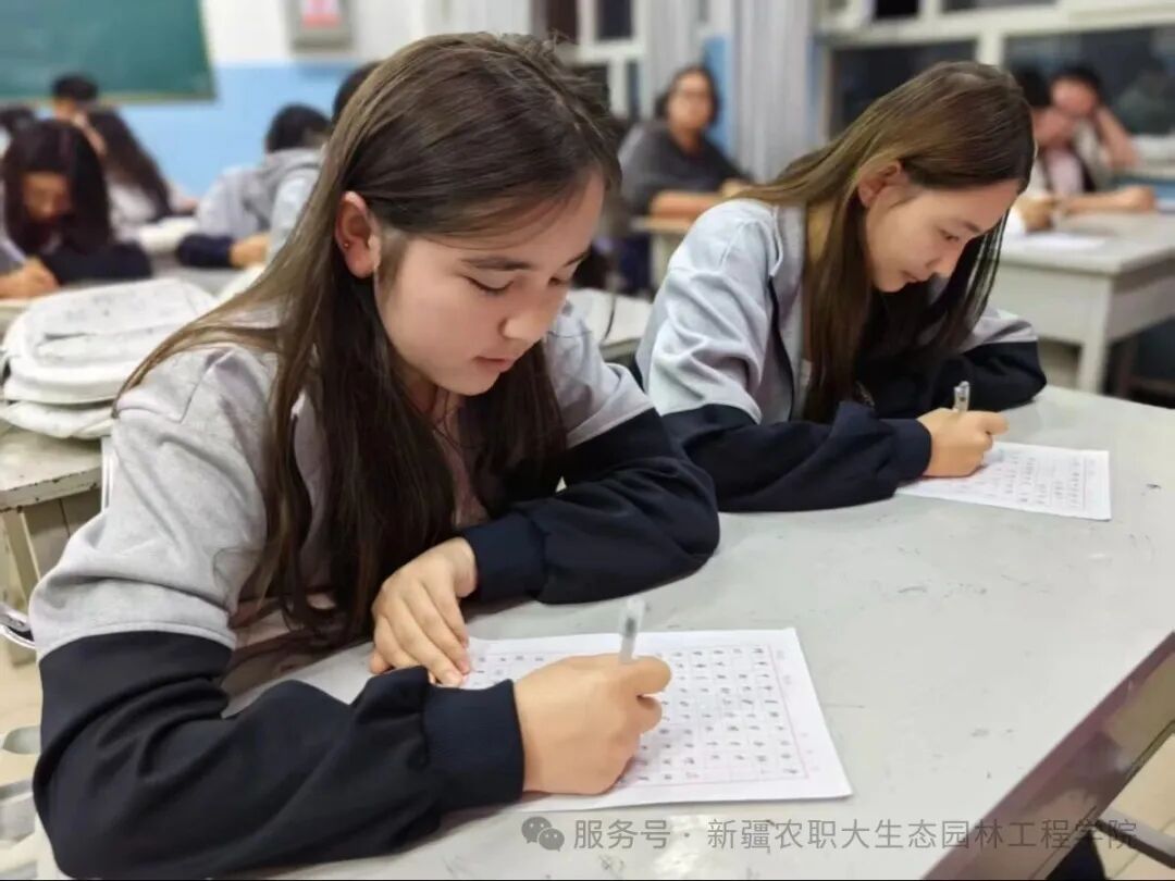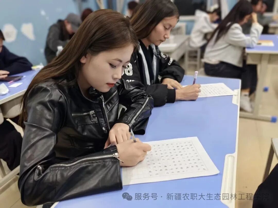 比赛过程中,学子们专注执笔,在学院提供的书写纸张上,从9篇指定内容中任选其一现场创作——指定书写内容既有新时代党的治疆方略、中华民族共同体意识、民族团结等主旋律内容,也有《水调歌头》《沁园春》等经典诗词。楷书端正大气、行书流畅潇洒,不同字体间尽显汉字之美,更传递出对家国的深情与对传统文化的热爱。