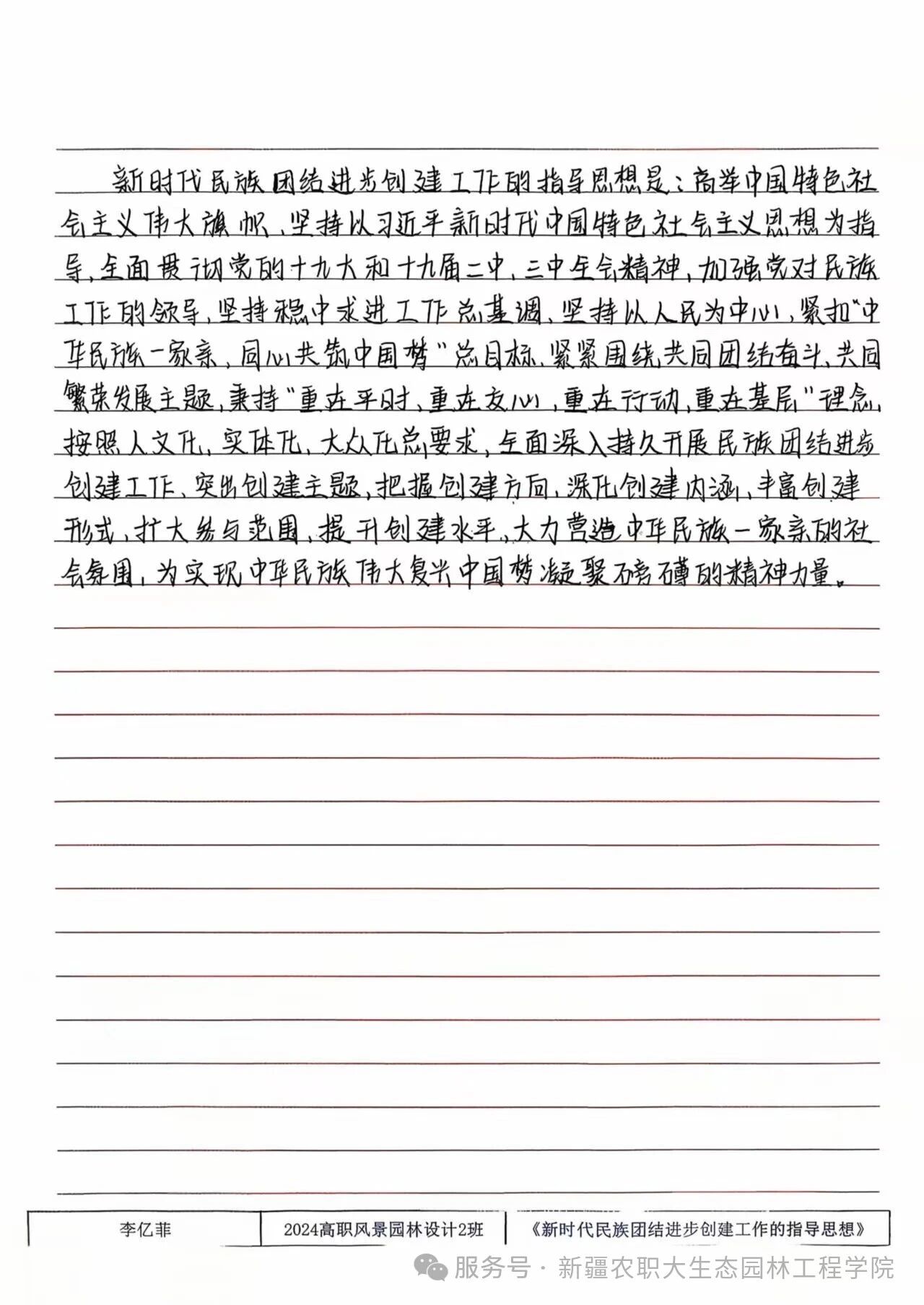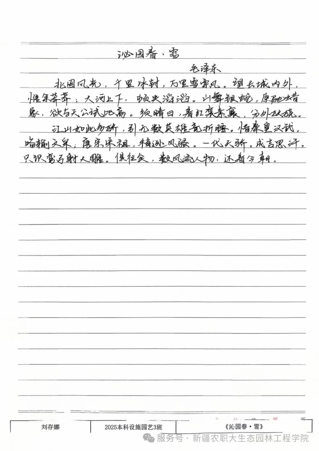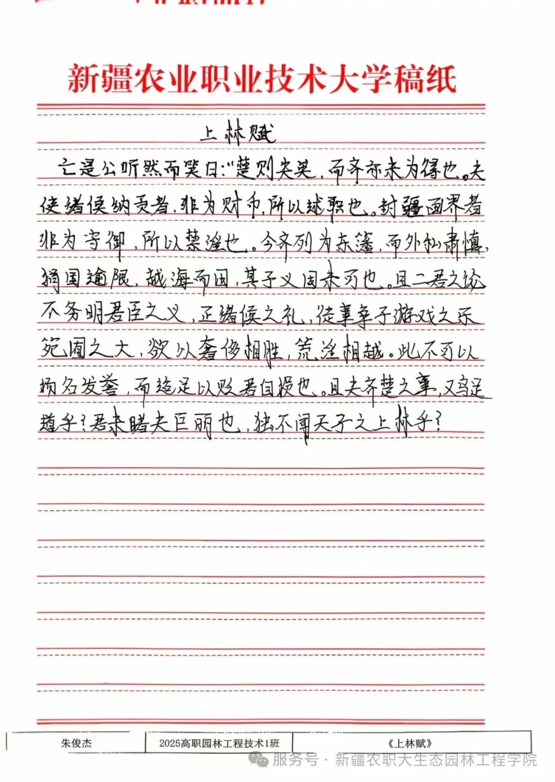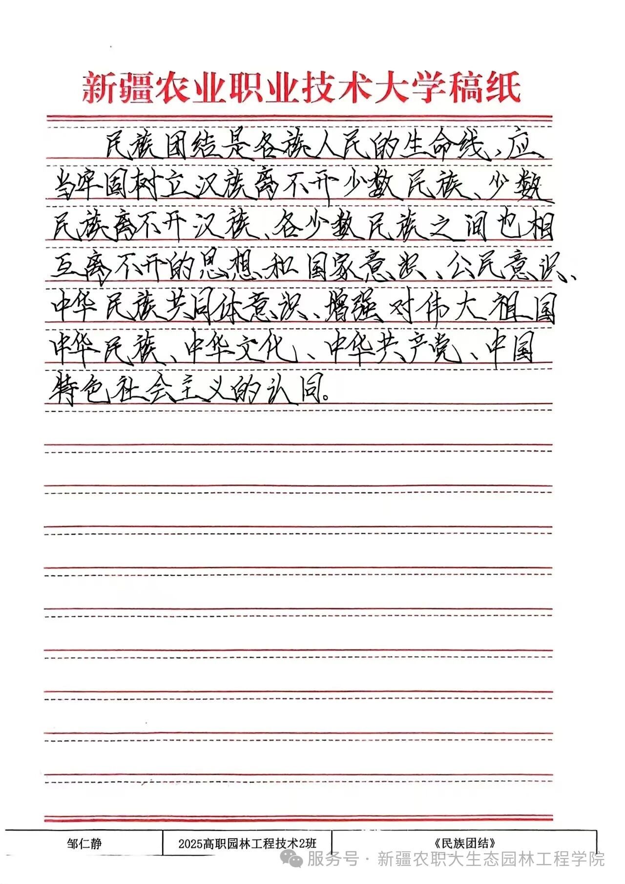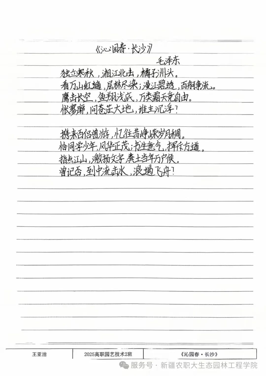比赛过程中,学子们专注执笔,在学院提供的书写纸张上,从9篇指定内容中任选其一现场创作——指定书写内容既有新时代党的治疆方略、中华民族共同体意识、民族团结等主旋律内容,也有《水调歌头》《沁园春》等经典诗词。楷书端正大气、行书流畅潇洒,不同字体间尽显汉字之美,更传递出对家国的深情与对传统文化的热爱。
