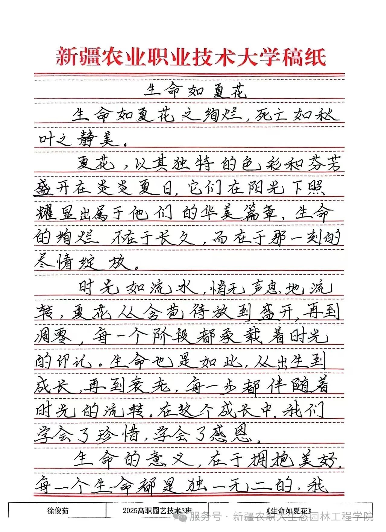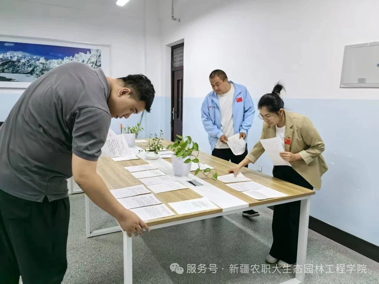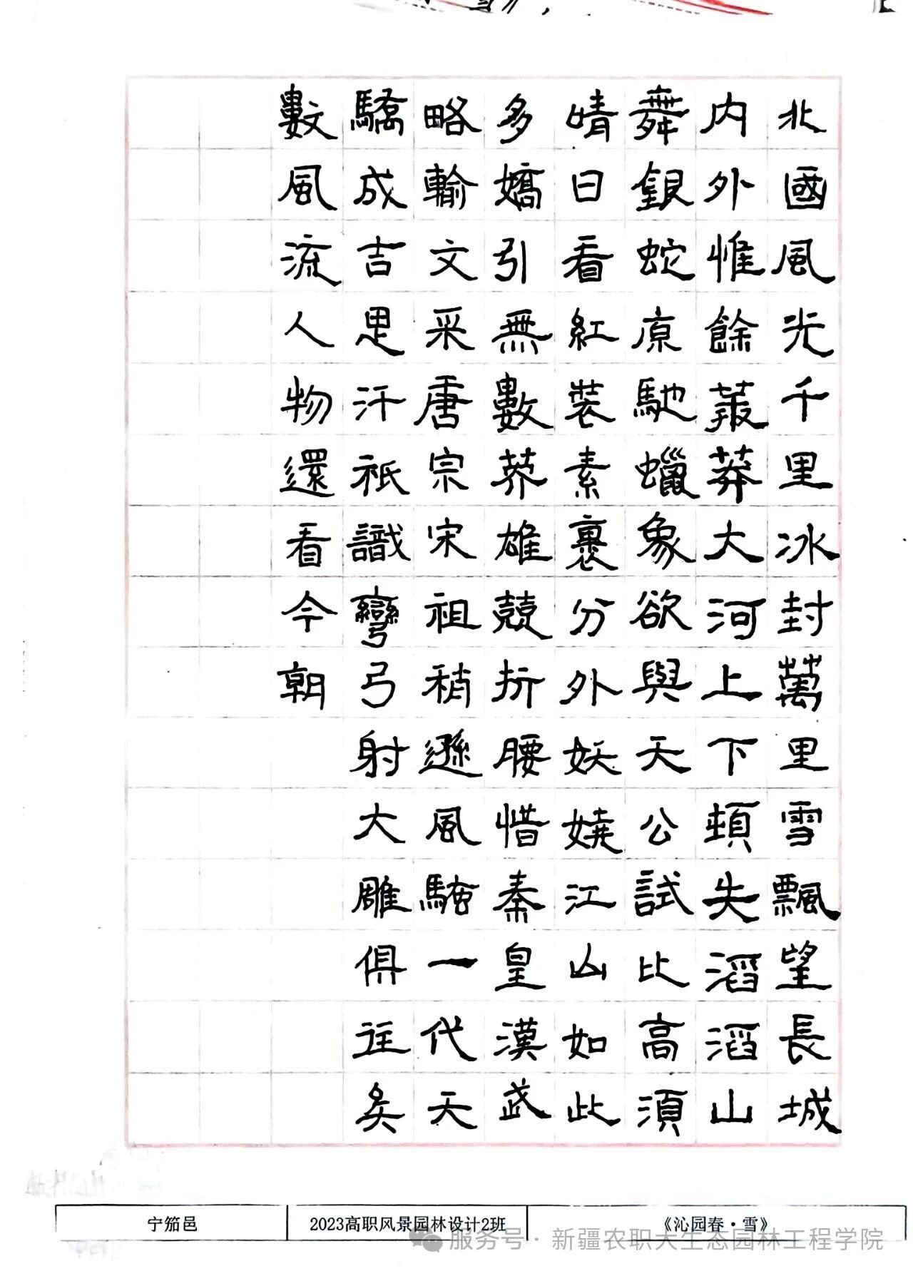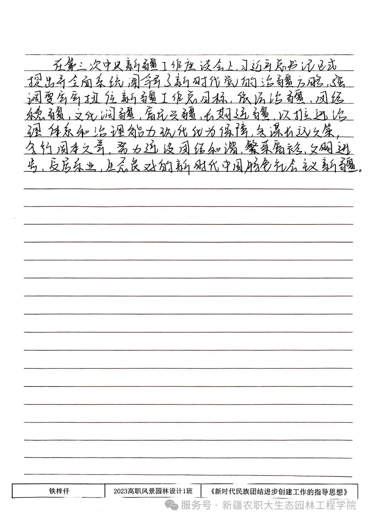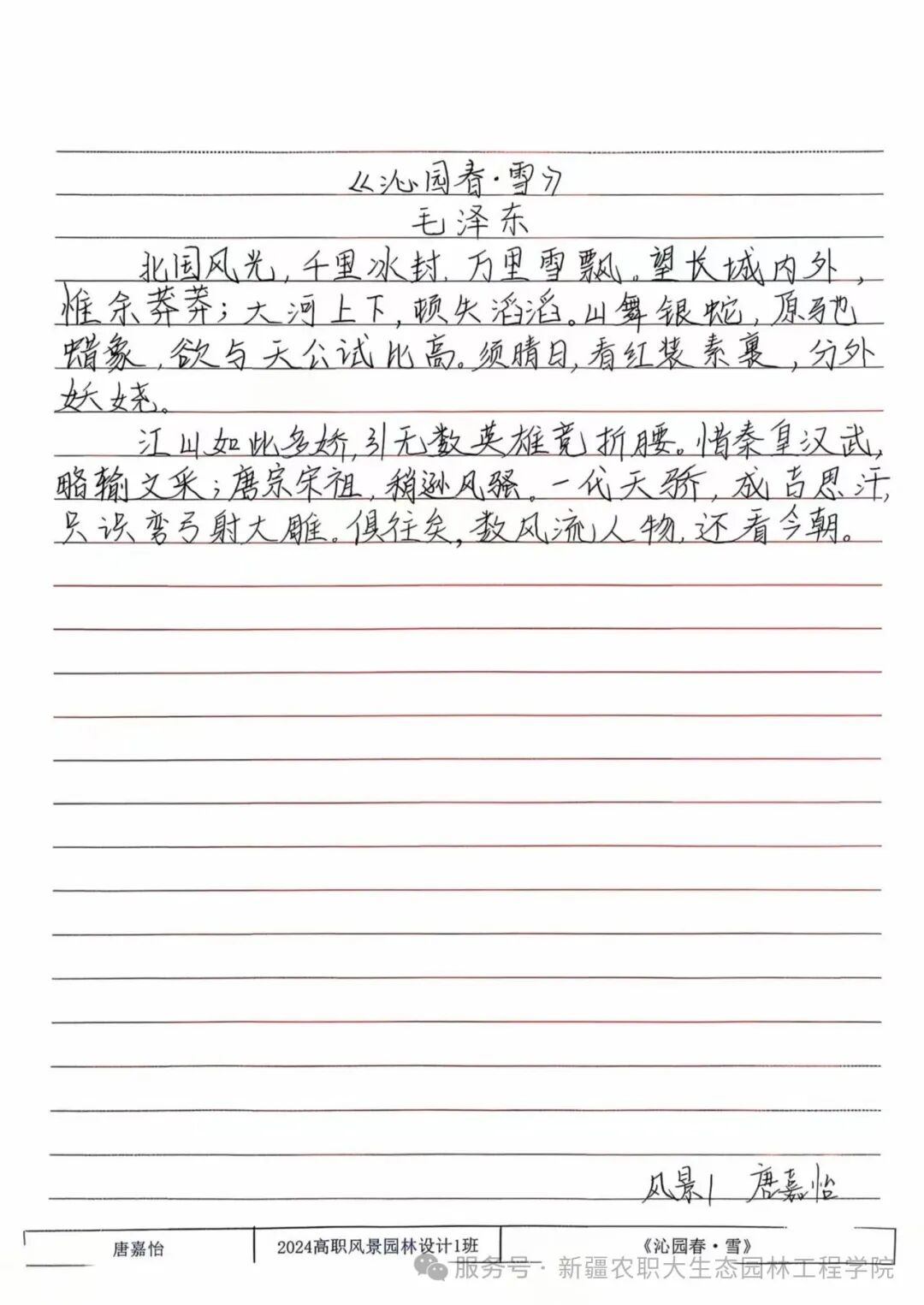 比赛过程中,学子们专注执笔,在学院提供的书写纸张上,从9篇指定内容中任选其一现场创作——指定书写内容既有新时代党的治疆方略、中华民族共同体意识、民族团结等主旋律内容,也有《水调歌头》《沁园春》等经典诗词。楷书端正大气、行书流畅潇洒,不同字体间尽显汉字之美,更传递出对家国的深情与对传统文化的热爱。