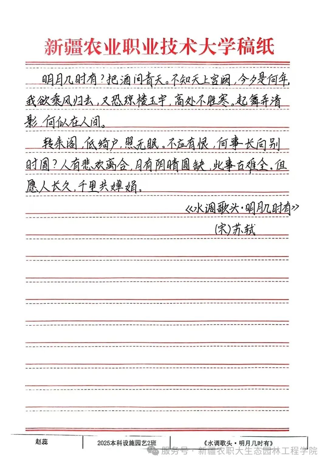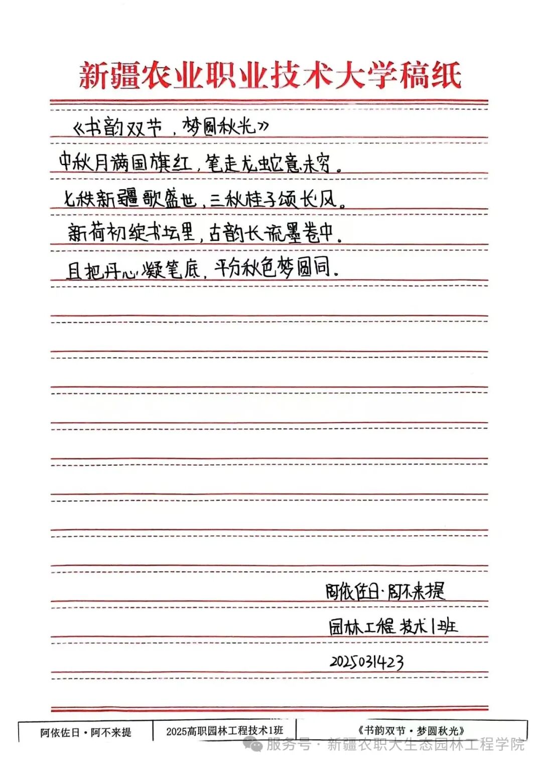 值中秋、国庆双节同庆,新疆维吾尔自治区成立 70 周年之际,为弘扬中华优秀传统文化,厚植文化自信与爱国情怀,营造浓厚校园文化氛围,提升学生汉字书写能力与艺术鉴赏水平,培养耐心、专注的学习品质,生态园林工程学院书法协会特策划“平分秋色 佳节梦圆”硬笔书法比赛,为广大热爱书法的学生提供展示才华、交流学习的平台。