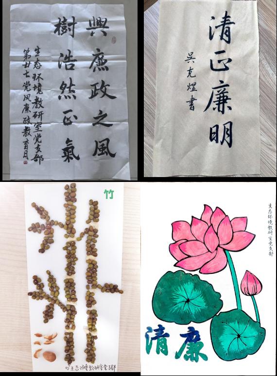 廉政创作环节亮点纷呈,党员们提交的书法、绘画、种子粘贴画等作品以艺术语言诠释廉洁内涵。两幅书画作品传递廉洁从政、处事公正清明的价值追求,一幅“荷花图”借其寓意展现党员对廉洁品质的崇尚,一张“种子粘贴画”借自然物象传递廉政内涵,展现创意与廉政文化融合。这些作品从不同艺术形式,将廉政文化具象化,助力活动营造崇廉尚洁氛围,加深党员对廉政的理解与践行。
