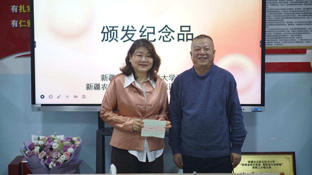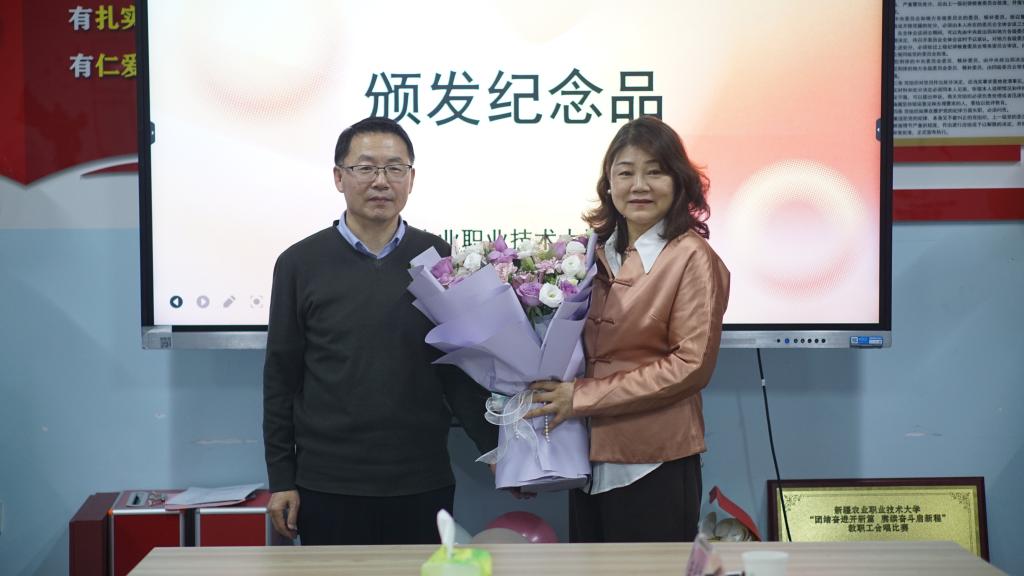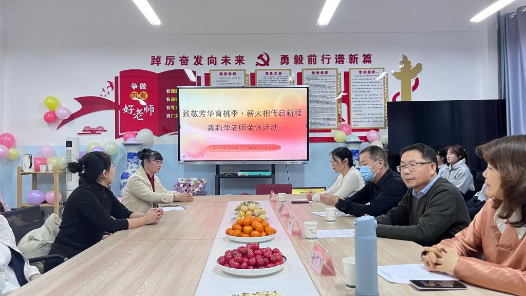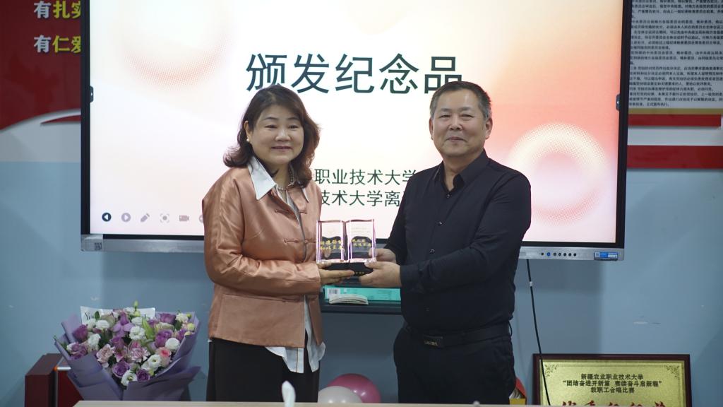 校工会办公室主任薛新强、离退休工作处综合服务中心主任何玉忠分别致辞,肯定了龚莉萍老师三十年如一日的无私奉献,高度赞扬她在教育教学、团队建设中作出的突出贡献。随后,为龚莉萍老师颁发退休证、定制纪念奖杯与感恩花束。