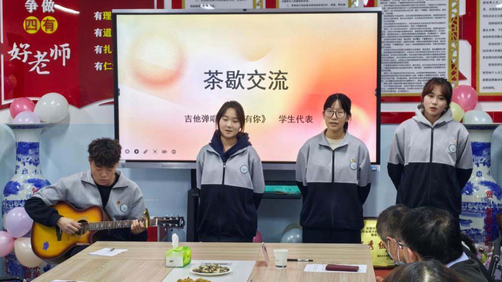 茶歇时段,学生代表怀抱吉他,轻声弹唱《一生有你》,道出学子们对龚莉萍老师的感恩与眷恋。老师们簇拥在龚莉萍老师身边,合影留念。