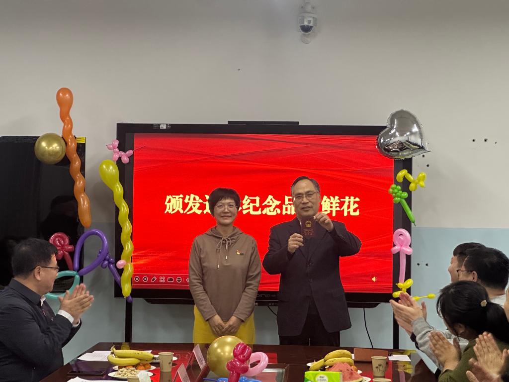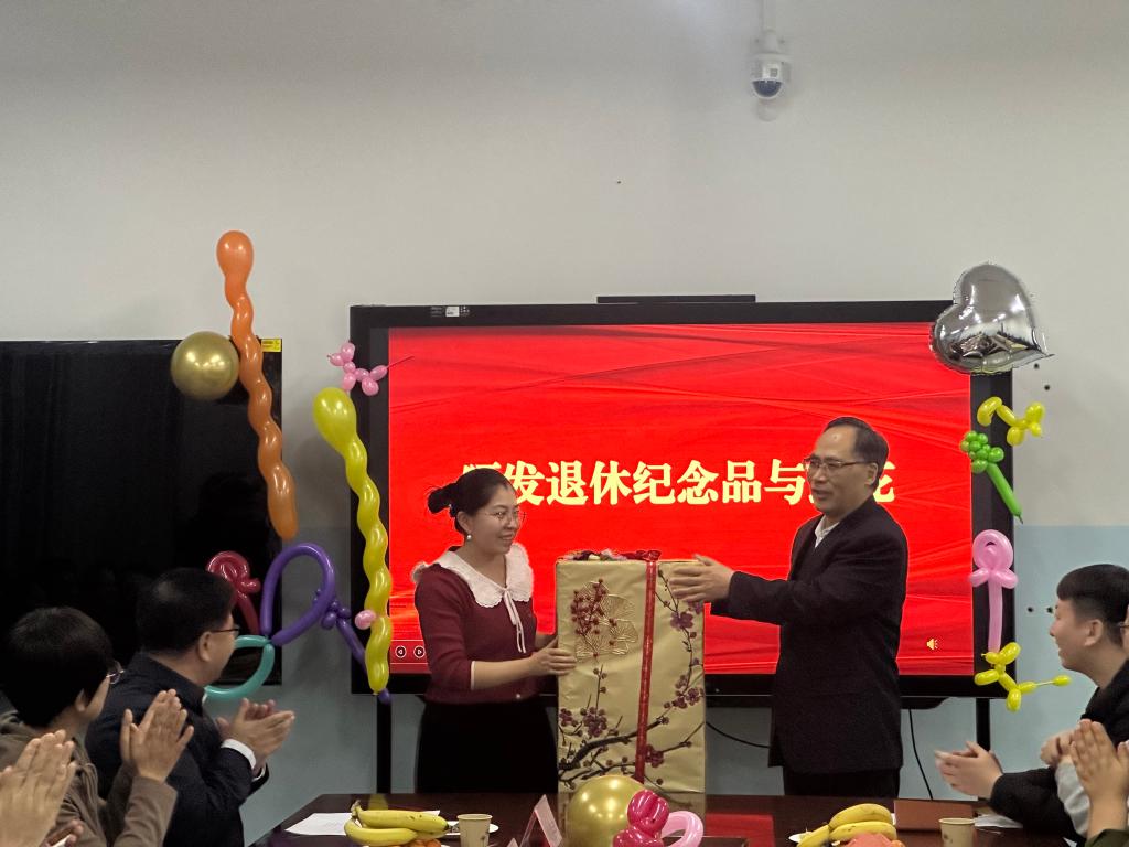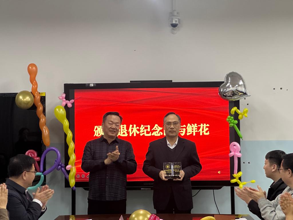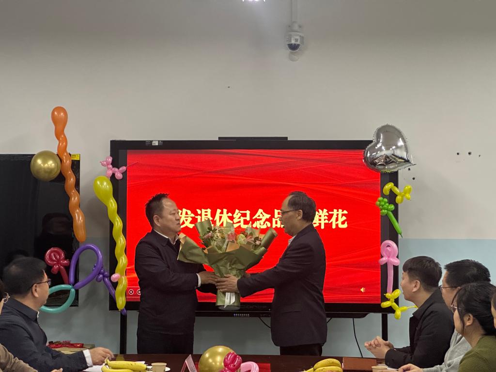 在颁发退休纪念品与鲜花环节,工会临时负责人马勇、离退休职工管理服务中心副主任周晓娟、环境工程教研室主任侯凤兰以及生物科技学院党总支负责人余超,分别为刘德江教授颁发退休纪念品、退休证书、送上礼物和鲜花,并合影留念。这些纪念品和鲜花承载着学院和师生们对刘教授的深厚感激之情与崇高敬意,象征着他教育事业的灿烂辉煌。