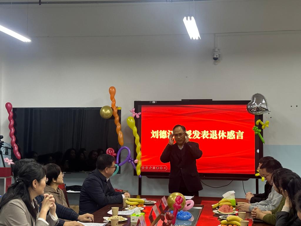 最后,刘德江教授发表退休感言。他回忆了自己入职38年来的工作、学习生活,表达了对学校和学院的感谢。质朴而真挚的话语,让大家深切感受到一位教育者对教育事业的热爱,令人深受感动。最后他祝愿学校蒸蒸日上,明天更美好,祝同事们在教学、科研的道路上蓬勃发展,培养出更多优秀人才。