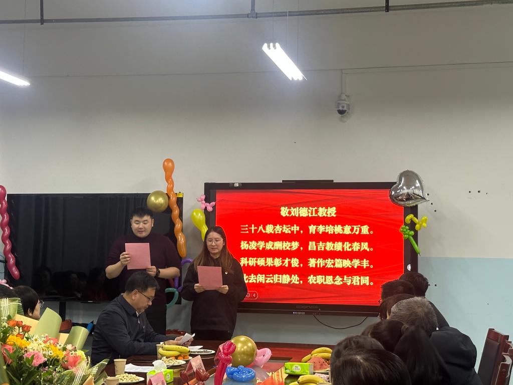 互动环节更是温馨感人,同事们纷纷分享与刘德江教授相处的难忘瞬间,送上最真挚的祝福。陈佳林老师、李瑜老师的发言情真意切,吕海涛老师、张馨尹老师带来的诗朗诵《敬刘德江教授》更是将对刘教授的敬意与祝福展现得淋漓尽致,现场气氛热烈而融洽。