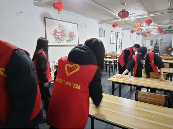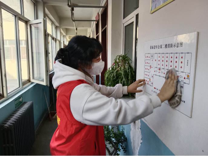 志愿者们在老年公寓内开展环境卫生大清扫工作,他们身穿红马甲,手拿扫把、抹布。擦扶手、清洗凳子、擦洗宣传栏,他们配合默契,干的热火朝天,不怕脏、不怕累,一个个忙碌的身影构成了新年伊始的“早春图”。