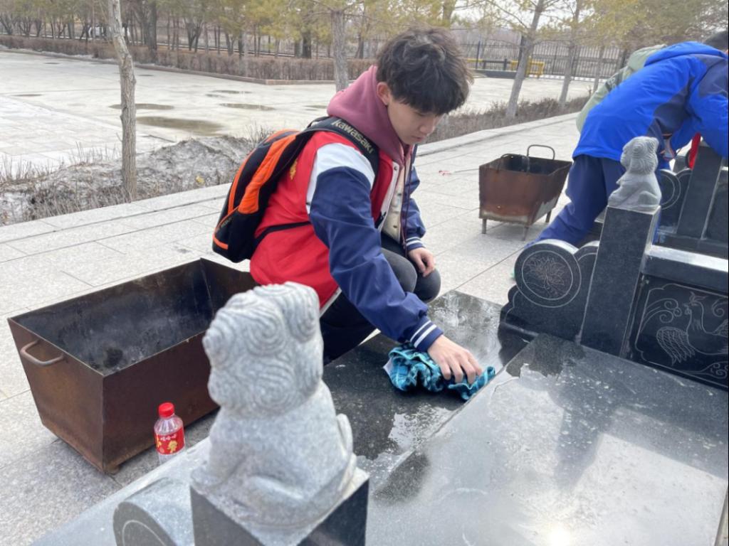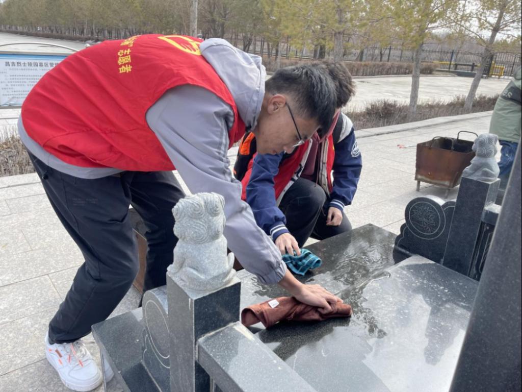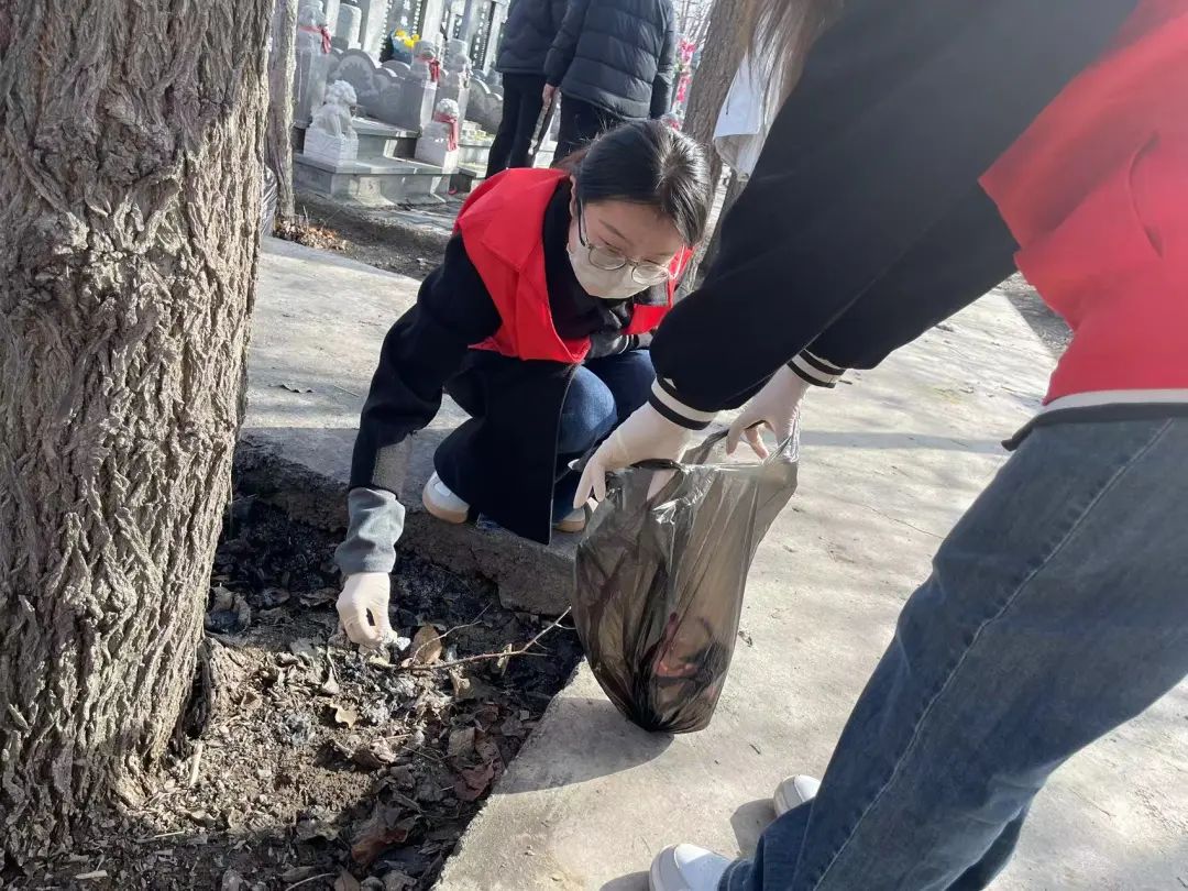 活动中,志愿者身穿红色志愿马甲,有的擦拭墓碑,有的对公共区域的落叶、塑料垃圾等进行清扫,经过志愿者的辛勤付出,烈士陵园更显凛然之势、肃穆之风,其环境更是焕然一新,同学们以实际行动缅怀革命先烈,弘扬中华民族传统美德。