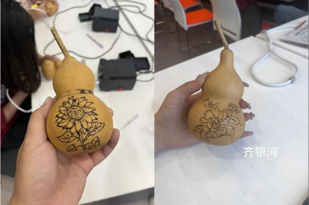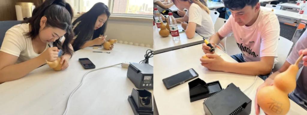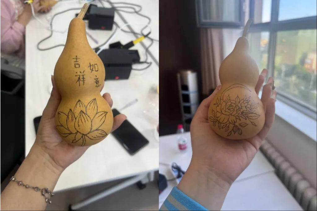 在理论讲解与实操技能的讲解中,陶老师结合葫芦耕种文化、器用文化、民俗文化,为学生们全方位展示了非遗葫芦文化之美,并现场向大家传授了葫芦烙画的基本技法。