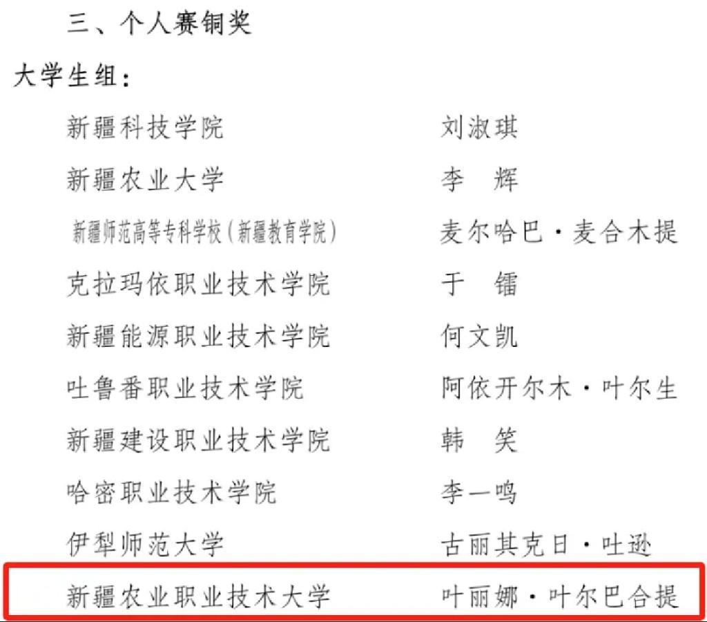 乡村振兴学院学生叶丽娜·叶尔巴合提荣获个人赛铜奖