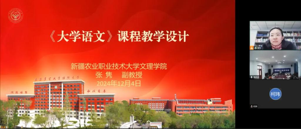 根据学校党委对口帮扶和田职业技术学院的工作安排,2024年12月4日下午文理学院文学教研室与和田职业技术学院基础部以线上方式开展了一场精彩的教学研讨活动。本次活动由文理学院文学教研室9位教师和和田职业技术学院基础部14位教师共同参与,聚焦《大学语文》课程教学设计,旨在探索更有效的教学方法与策略,以提升学生的语文素养与综合能力。