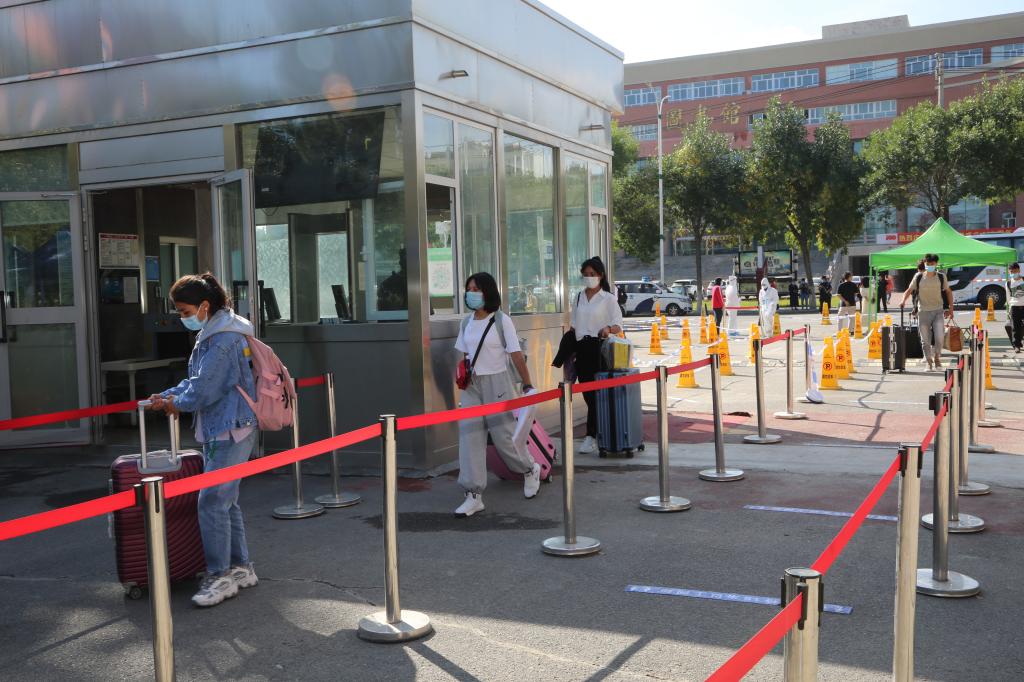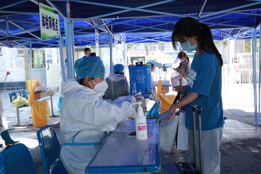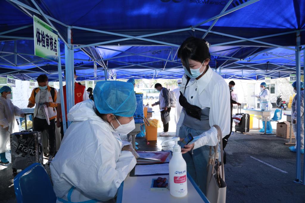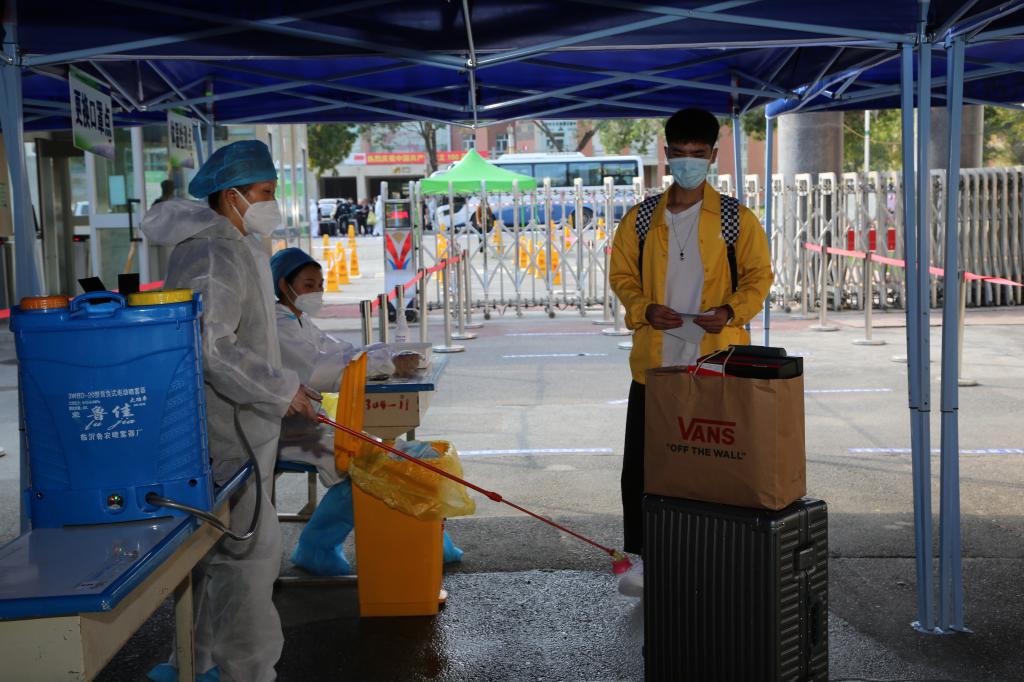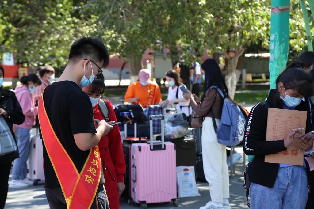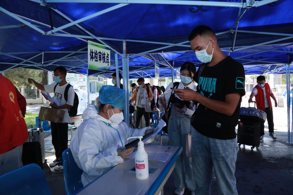 “同学,你好!请测温、请出示健康码、请做核酸检测。”根据疫情防控常态化工作要求,学校错时错峰、分批分流安排新生入学报到。新生在工作人员的引导下,佩戴口罩、间隔1米以上,有序进入报到专用通道,完成“一码一卡”核验、手部清洁、更换口罩、测量体温、行李消杀、核酸检测后进入校园。