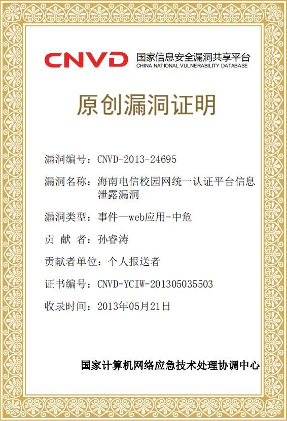 1、荣获CNVD国家信息安全漏洞共享平台原创漏洞证书(国家级)