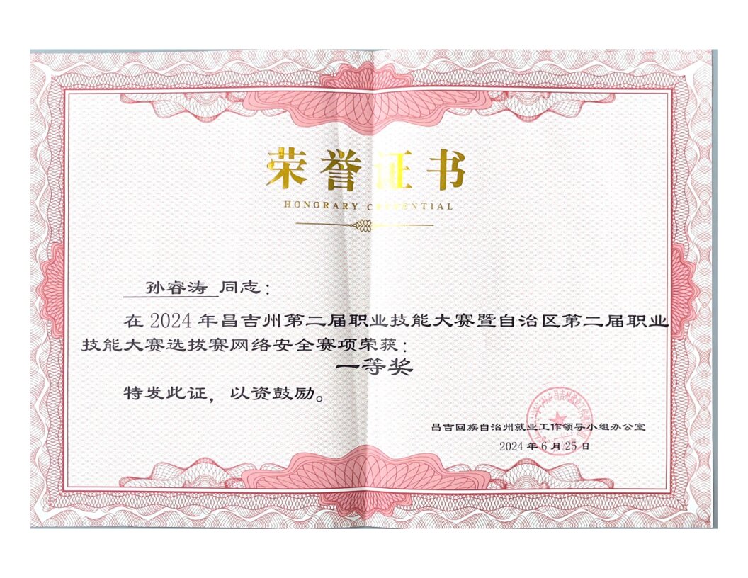 4、指导学生参加2021年新疆维吾尔自治区职业院校技能大赛“信息安全管理与评估”赛项获得二等奖;指导学生参加2021年新疆高校大学生信息安全大赛获得一等奖1个、二等奖2个,指导学生参加2022年新疆高校大学生信息安全大赛获得二等奖2个、三等奖4个;指导学生参加2023年新疆维吾尔自治区职业院校技能大赛“信息安全管理与评估”赛项获得一等奖;指导学生参加2023年新疆高校大学生信息安全大赛获得二等奖2个、三等奖2个;指导学生参加2024年新疆维吾尔自治区职业院校技能大赛“信息安全管理与评估”赛项获得一等奖;指导学生参加2024年新疆高校大学生信息安全大赛获得一等奖1个、二等奖3个,指导学生参加2024年新疆高校大学生信息安全大赛(暨2024年自治区普通高校学科和技能竞赛全国大学生信息安全竞赛(新疆赛区))获得一等奖1个、二等奖2个;指导学生参加2025年新疆职业院校技能大赛“信息安全管理与评估”赛项获得一等奖。