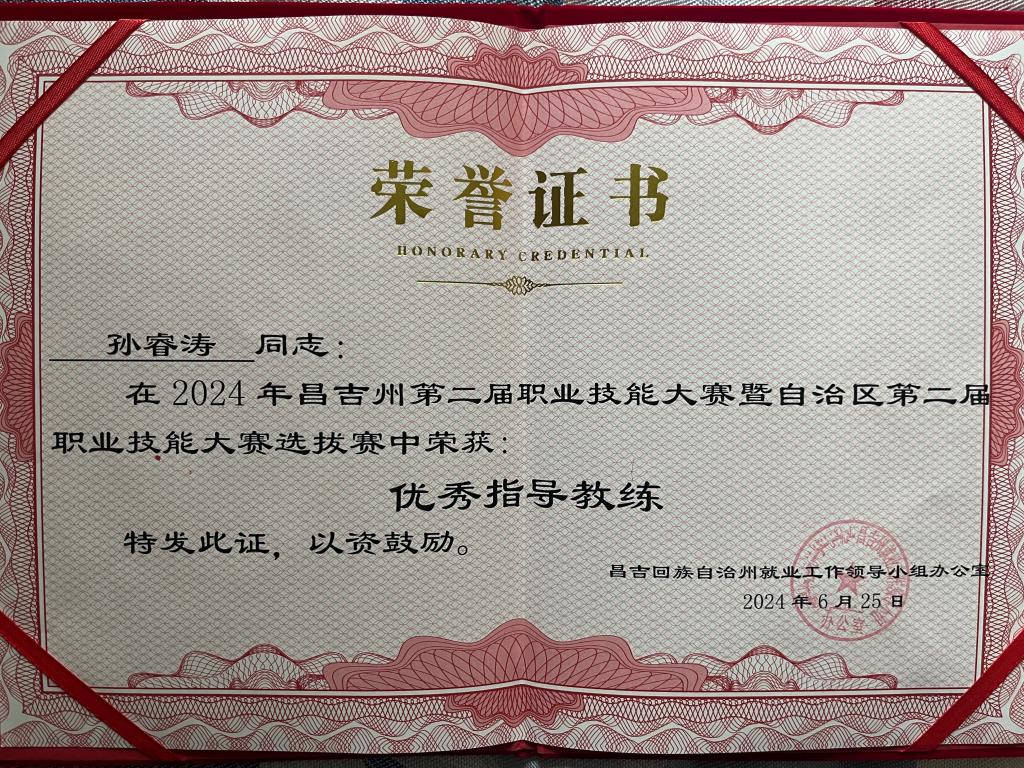 8、荣获2024年昌吉州第二届职业技能大赛暨自治区第二届职业技能大赛选拔赛优秀指导教练